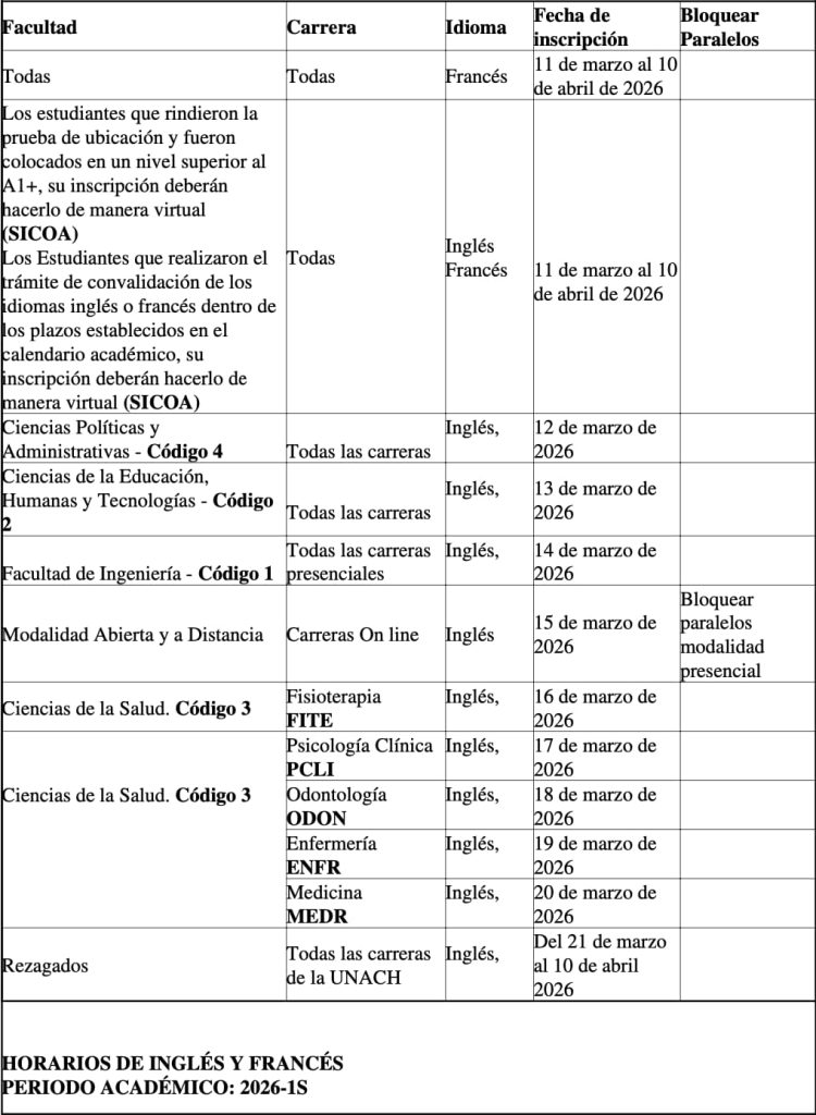 CRONOGRAMA DE MATRICULAS DE COMPETENCIAS LINGUISTICAS PERIODO ACADÉMICO 2026-1S