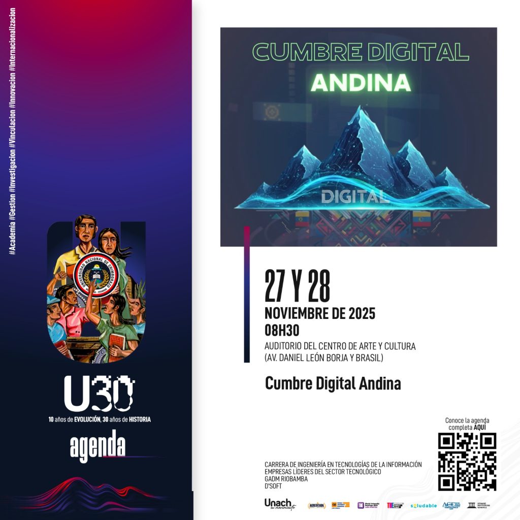 La carrera de Ingeniería en Tecnologías de la Información, D’Soft, Edwin Llauca junto al GADM Riobamba y empresas líderes del sector tecnológico, te invita a uno de los eventos más importantes de innovación y transformación digital del año.