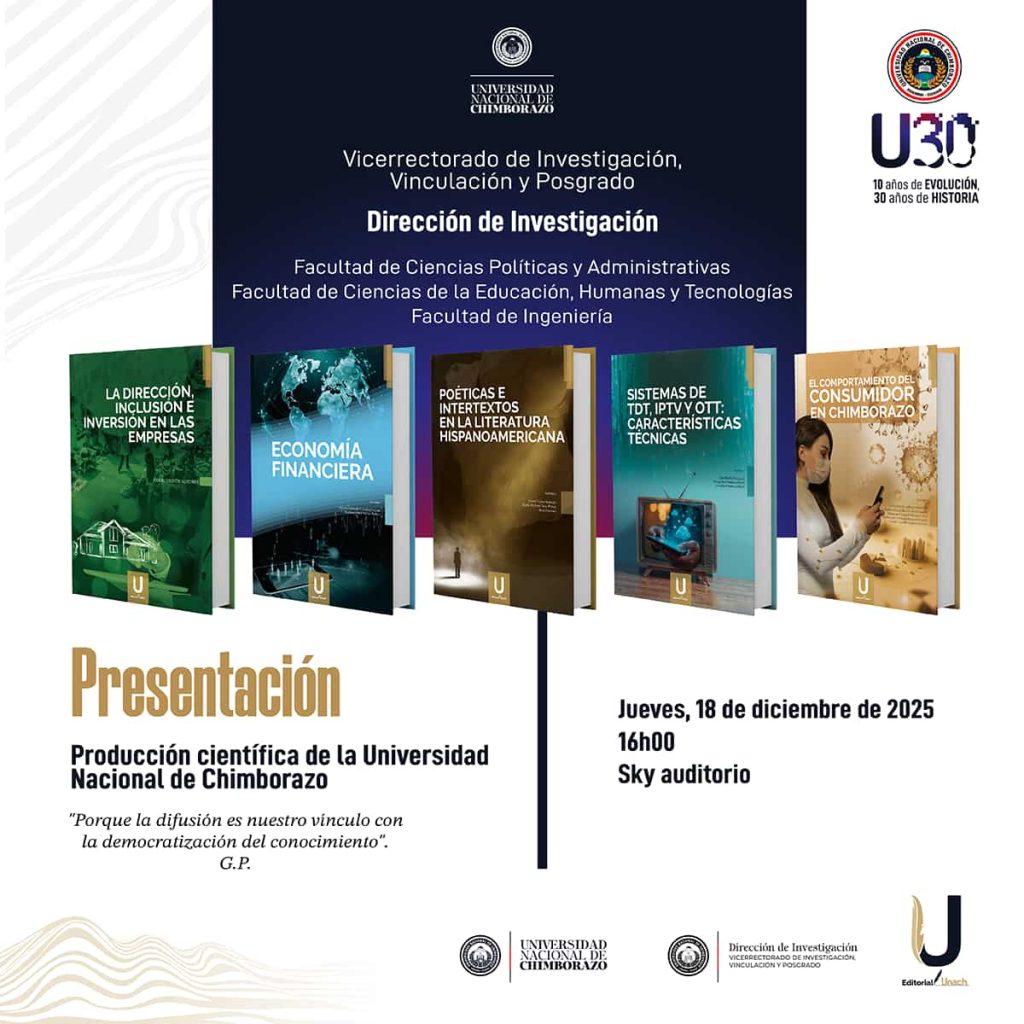 El 18 de diciembre de 2025, la Editorial UNACH presentará cinco obras de investigadores de las facultades de Ciencias Políticas y Administrativas, Ciencias de la Educación, Humanas y Tecnologías, e Ingeniería de la Universidad Nacional de Chimborazo. El evento se realizará a las 16:00 en el auditorio Sky.