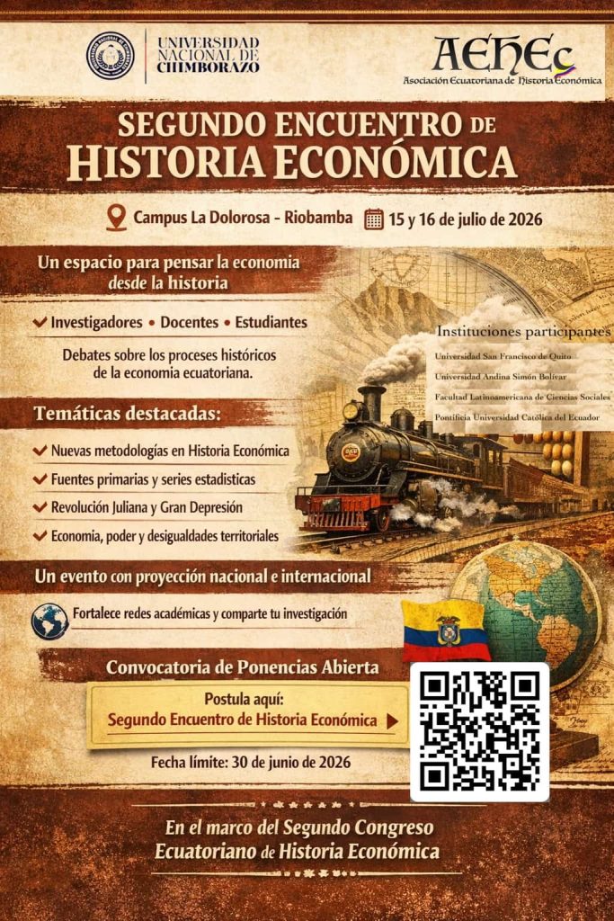 El “Segundo Encuentro de Historia Económica”, organizado por la Universidad Nacional de Chimborazo y la Asociación Ecuatoriana de Historia Económica, se llevará a cabo los días 15 y 16 de julio en la ciudad de Riobamba. Este evento académico reunirá a investigadores, docentes y estudiantes con el objetivo de generar un espacio de debate y reflexión sobre los procesos históricos que han configurado la economía ecuatoriana. En línea con otros encuentros científicos desarrollados por la universidad, se busca fortalecer la cultura investigativa y promover el intercambio de conocimientos a nivel nacional e internacional.